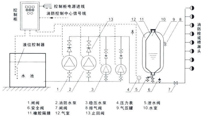 特點: 由于采用橡膠膜作為氣水分離物,所以這種消防氣壓給水設備不需經常補氣,省卻了補氣裝置,簡化了設備結構,降低了故障率;同時由于使氣水相分離,防止了氣水混合,因此減少了水的氣化和由于氣化所造成的汽濁現象。