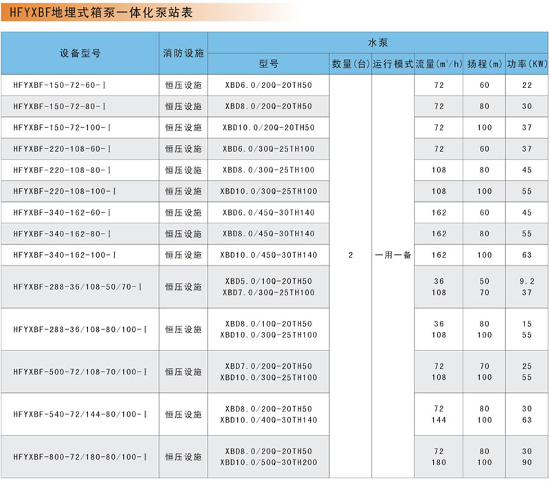 隨著現(xiàn)代化城市的迅速發(fā)展,高層建筑的日新月異,高位水塔已經(jīng)不能滿足高層建筑的供水要求,在這種條件下,自動化供水設(shè)備發(fā)展迅速,主要有變頻恒壓供水設(shè)備、管網(wǎng)疊壓無負(fù)壓供水設(shè)備和箱泵一體化泵站三種。 富亞公司生產(chǎn)的地埋式箱泵一體化消防泵站,是根據(jù)公安部標(biāo)準(zhǔn)GB 27898.2-2011《消防自動恒壓給水設(shè)備》和國標(biāo)02S101圖集設(shè)計(jì)的新型消防專用固定滅火裝置。設(shè)備主要由不銹鋼消防水箱/熱鍍鋅鋼板水箱/SMC水箱,消防增壓泵、穩(wěn)壓泵,氣壓罐,控制柜,傳感器,儀表,管道附件等組成;是取代混凝土消防水池的理想產(chǎn)品,可節(jié)約投資30%以上。廣泛適用于多層建筑、高層建筑和廠礦企業(yè)等有消防增壓設(shè)計(jì)要求的消火栓系統(tǒng)及噴淋系統(tǒng)等各類消防給水系統(tǒng)。 它是綜合了變頻恒壓供水設(shè)備和管網(wǎng)疊壓無負(fù)壓供水設(shè)備的的優(yōu)點(diǎn),是根據(jù)自來水管網(wǎng)壓力反饋,將設(shè)備的進(jìn)水水源智能變換,自來水服務(wù)壓力很高或者用水低峰時(shí),它就會自動將設(shè)備進(jìn)水源的電動閥打開,水箱供水電動閥關(guān)閉;當(dāng)用水高峰時(shí),它就會自動關(guān)閉自來水進(jìn)水電動閥,并打開水箱供水電動閥,此時(shí)它又變?yōu)榱藗鹘y(tǒng)的變頻恒壓供水設(shè)備。絕不會減少自來水管網(wǎng)的服務(wù)壓力。